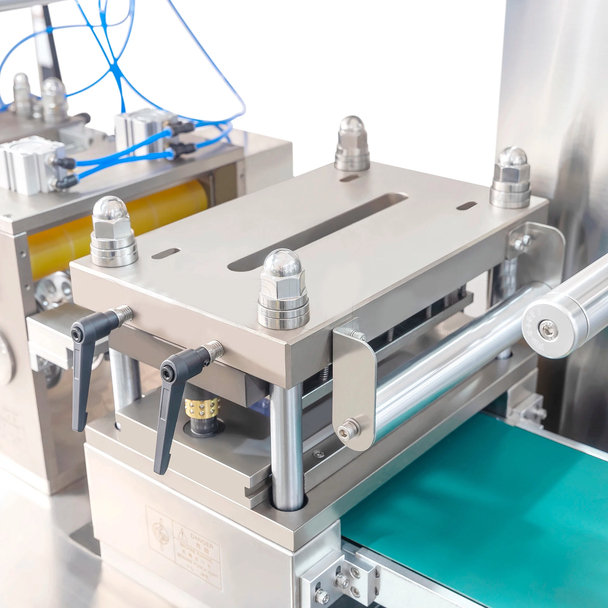 Pembentukan blister PVC, pengisian bahan otomatis, pengepresan datar dan penyegelan panas aluminium foil PTP, penyelarasan grafis, pencetakan nomor batch, pengepresan garis sobek, pelubangan pelat obat, dan pemulihan limbah.