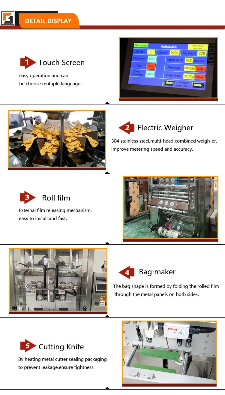 Ini adalah mesin pengemas makanan serbaguna, yang terutama digunakan untuk mengemas makanan kering, seperti camilan, buah kering, dan lainnya. Mesin ini termasuk dalam perangkat kemasan primer, yang langsung mengemas makanan, membentuk unit kemasan yang independen, memudahkan penjualan di pasar.