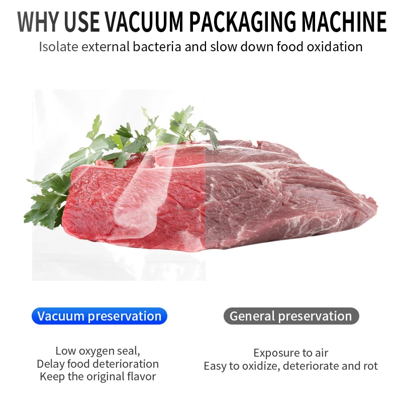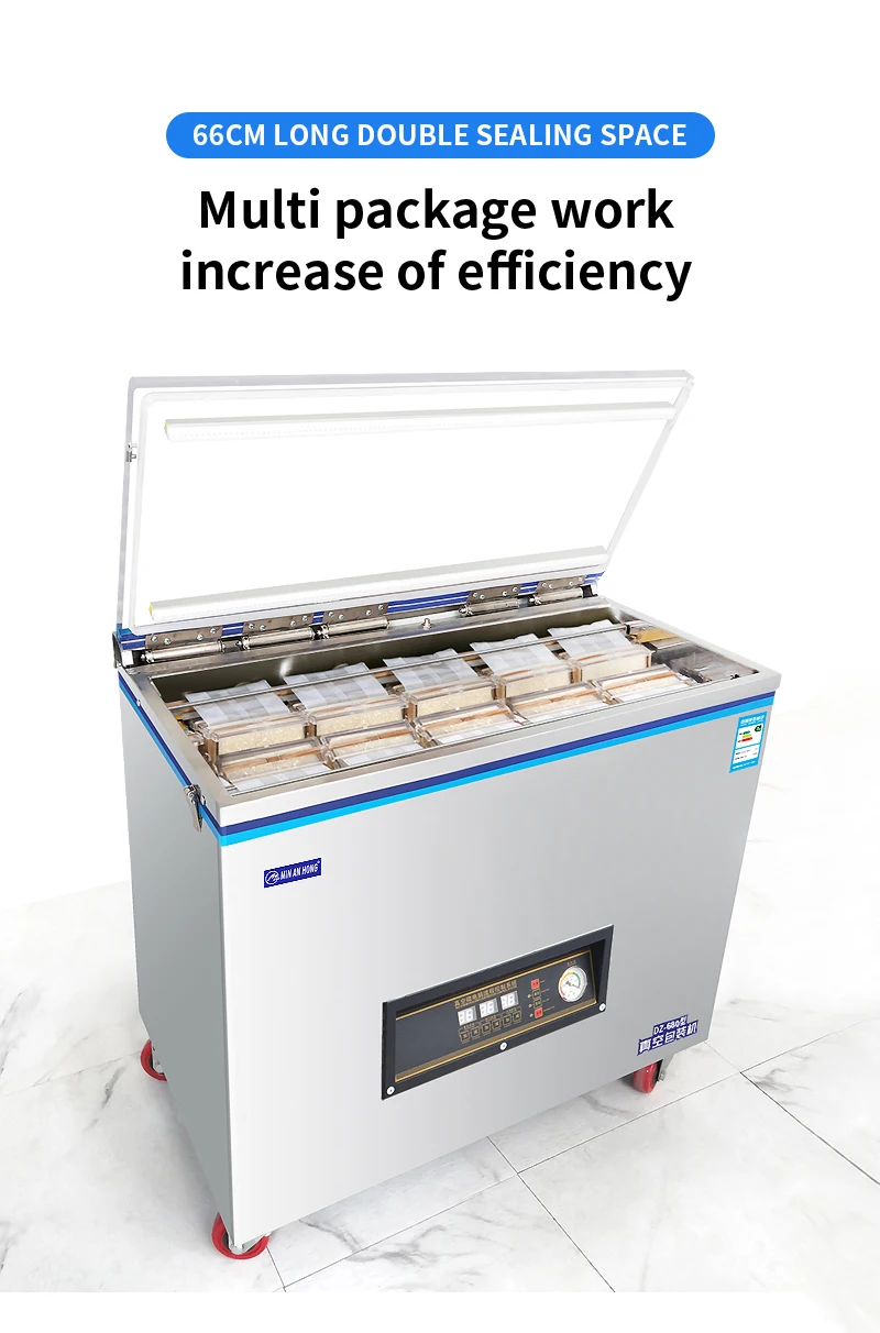 Mesin pembungkusan vakum ini termasuk dalam kemasan primer, karena langsung mengemas makanan menjadi unit kemasan terpisah sebelum dipasarkan. Dengan teknologi penyegelan vakum, mesin ini memperpanjang masa simpan makanan dan cocok untuk menjaga kesegaran berbagai produk.