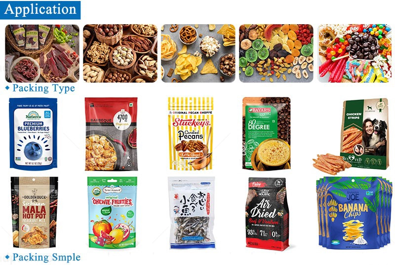 Digunakan secara luas untuk berbagai aplikasi seperti biji-bijian, batang, irisan, bulat, produk bentuk tidak beraturan seperti dendeng sapi, biltong, daging kering, permen, cokelat, jeli, pasta, biji melon, biji panggang, kacang tanah, pistachio, kacang almond, kacang mede, kacang-kacangan, biji kopi, keripik, kismis, plum, sereal dan makanan ringan lainnya, makanan hewan peliharaan, makanan kembung, sayur, sayuran kering, buah-buahan, makanan laut, makanan beku, perkakas kecil, dll.