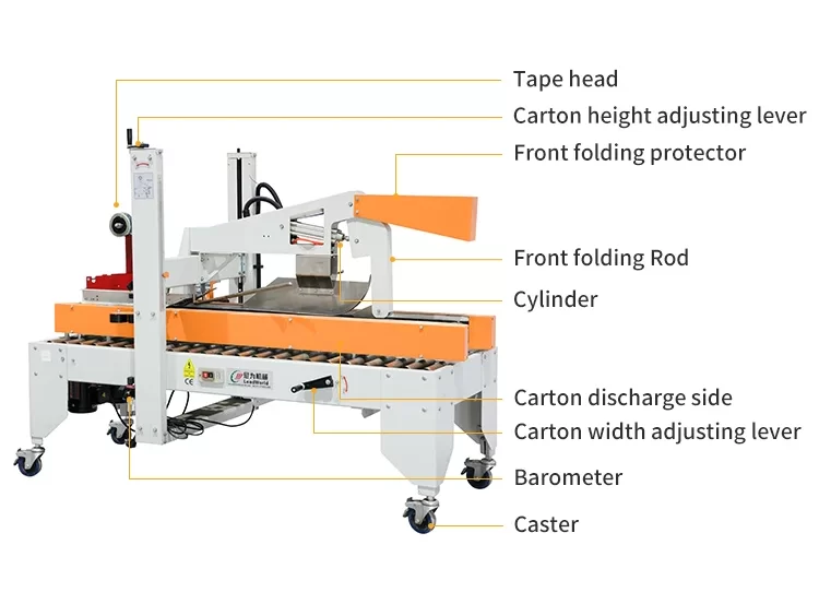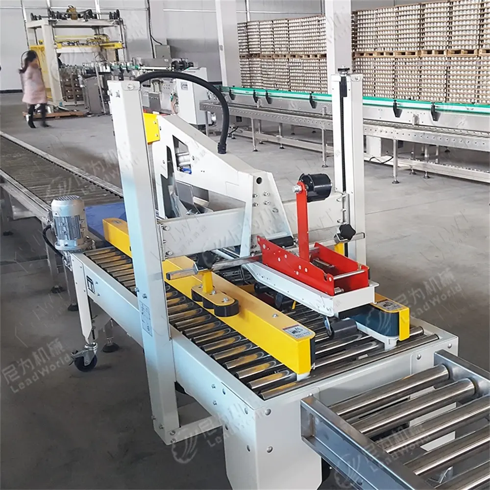 - Penyegelan kotak: Mesin menggunakan pita perekat di dalamnya untuk menutup bagian atas dan bawah kotak karton, memastikan kemasan tetap kokoh.