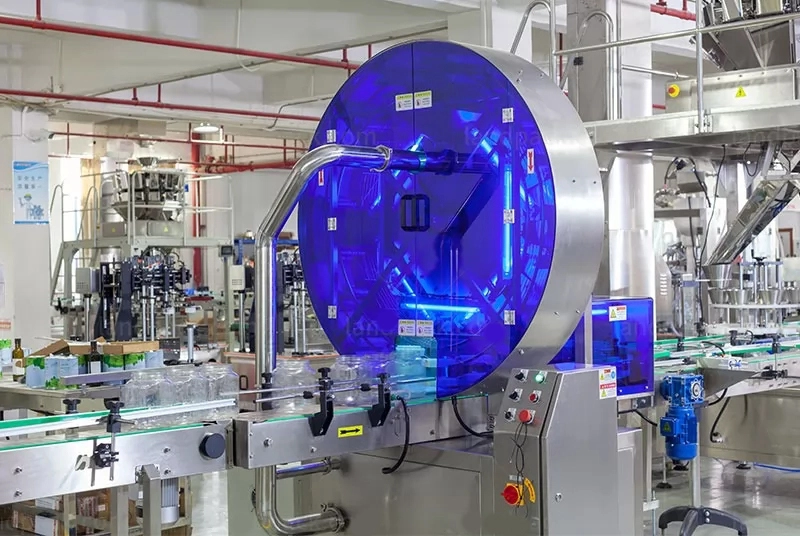 Dilengkapi dengan sterilisator ultraviolet (UV), yang dapat mensterilkan bagian dalam botol dan menghilangkan debu sebelum pengisian, memastikan efek pembersihan di dalam tangki, sangat cocok digunakan sebagai mesin produksi air kemasan gelas dan produk lainnya yang memiliki persyaratan kebersihan tinggi.