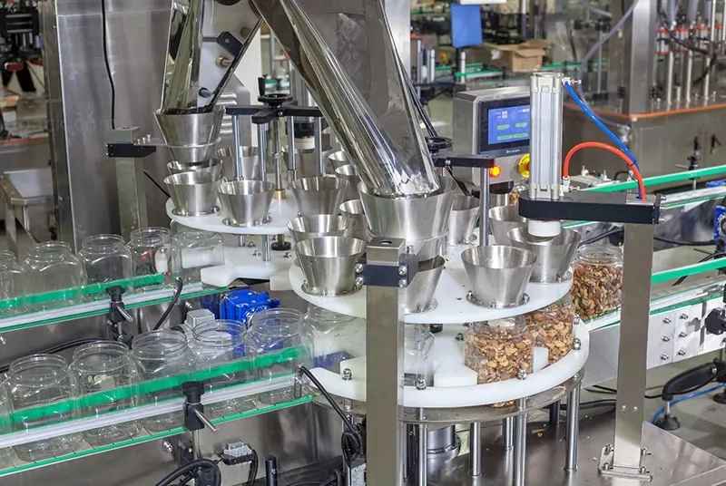 Cocok untuk pengisian botol otomatis berbagai produk granular, seperti kacang, biji kopi, kacang tanah, permen, biji-bijian, keripik kentang, popcorn, almond, buah kering, salad sayuran, makanan beku, jeli, biskuit, cokelat, filbert, jagung, makanan hewan peliharaan, dll.