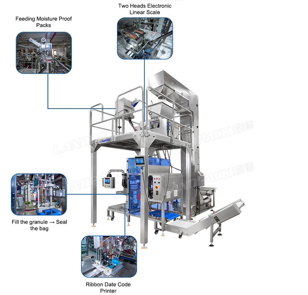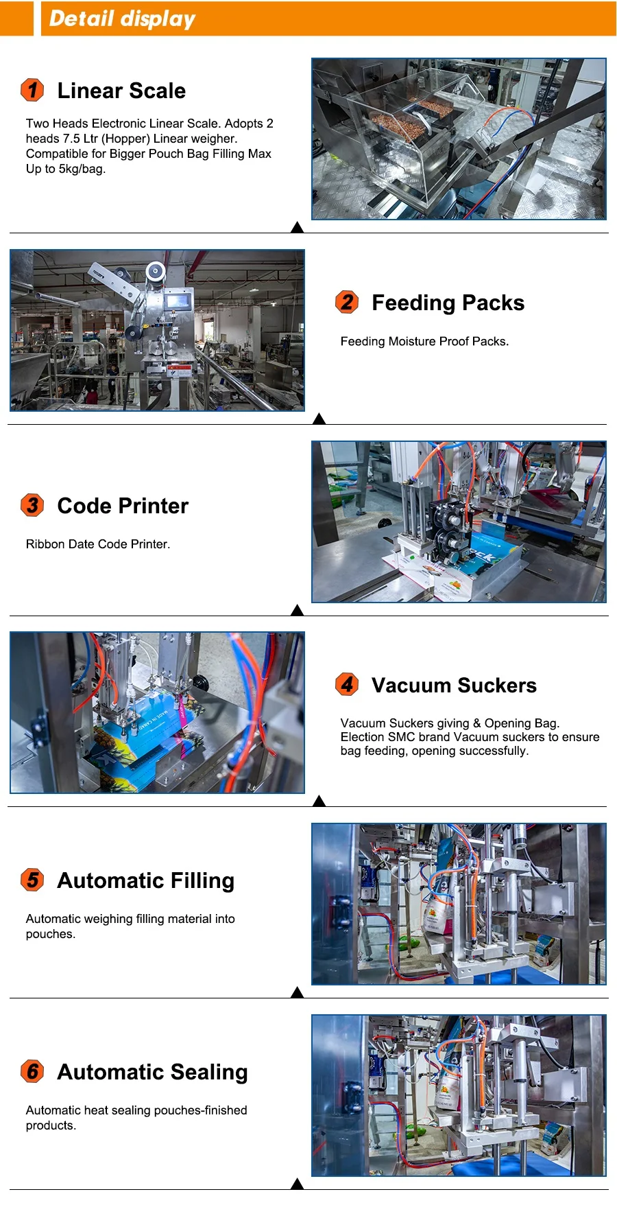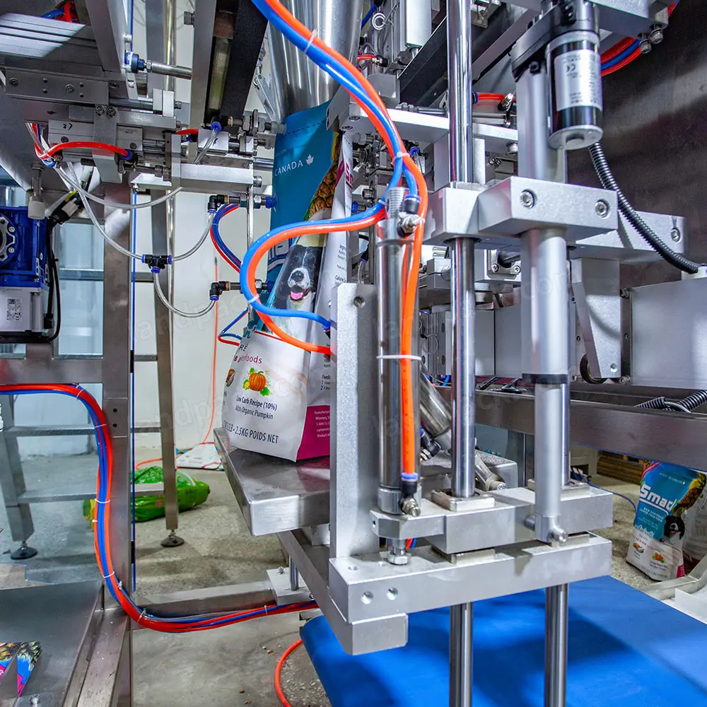 Ini adalah mesin pengemas makanan granule otomatis, yang termasuk dalam perangkat kemasan primer. Mesin ini menggunakan desain kantong berdiri Doypack, dan utamanya digunakan untuk mengemas makanan hewan peliharaan, camilan, dan produk berbentuk granule lainnya. Mesin Doypack ini dapat mengemas hingga 1kg, dilengkapi dengan penutupan ritsleting, cocok untuk langsung mengemas produk, membentuk unit penjualan yang terpisah.