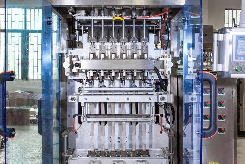 - Fungsi utama mesin: pemisahan film otomatis pada posisi yang tepat, pengukuran dan pengisian cairan, penyegelan pengisian bentuk kantong multi-jalur, pemotongan, pelacakan sensor, penghitungan kapasitas, dll;