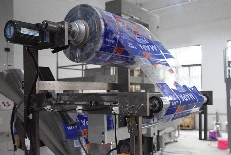 Mesin pengemas vertikal otomatis (Vertical Form Fill Seal, VFFS). Mesin kemasan ini utama digunakan untuk kemasan produk berbentuk bubuk dan menyelesaikan proses pengemasan dengan cara vertikal.