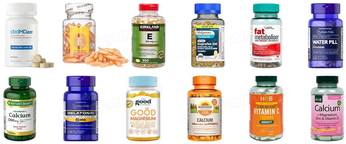 Rangkaian mesin otomatis ini cocok untuk pengemasan berbagai produk obat-obatan dan suplemen kesehatan, di antaranya: