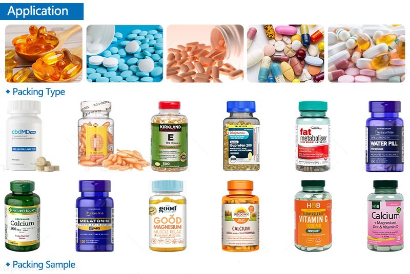 Lini pengisian penghitungan ini cocok untuk penguraian botol yang sepenuhnya otomatis, penghitungan, pengisian, penyegelan, penutupan, pelabelan, dan alur kerja lainnya (pengemasan opsional) dari berbagai produk granular. Seperti tablet, pil, kapsul, permen karet, gel lunak, dll.