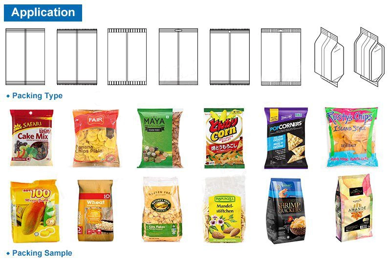 Cocok untuk mengemas semua jenis bahan biji-bijian, bahan lembaran, bahan strip, dan bahan abnormal seperti permen, biji bunga matahari, kacang tanah, kacang-kacangan, kacang polong, keripik kentang, popcorn, almond, buah kering, salad sayuran (sayuran yang diiris atau diiris, seperti selada gunung es, kubis, selada romaine, daun bawang, dan daun bawang, dll.), makanan beku, jeli, biskuit, cokelat, filbert, jagung, makanan hewan peliharaan, bahan makanan dilatant, perangkat keras, dan plastik yang dapat ditimbang berdasarkan rasio.