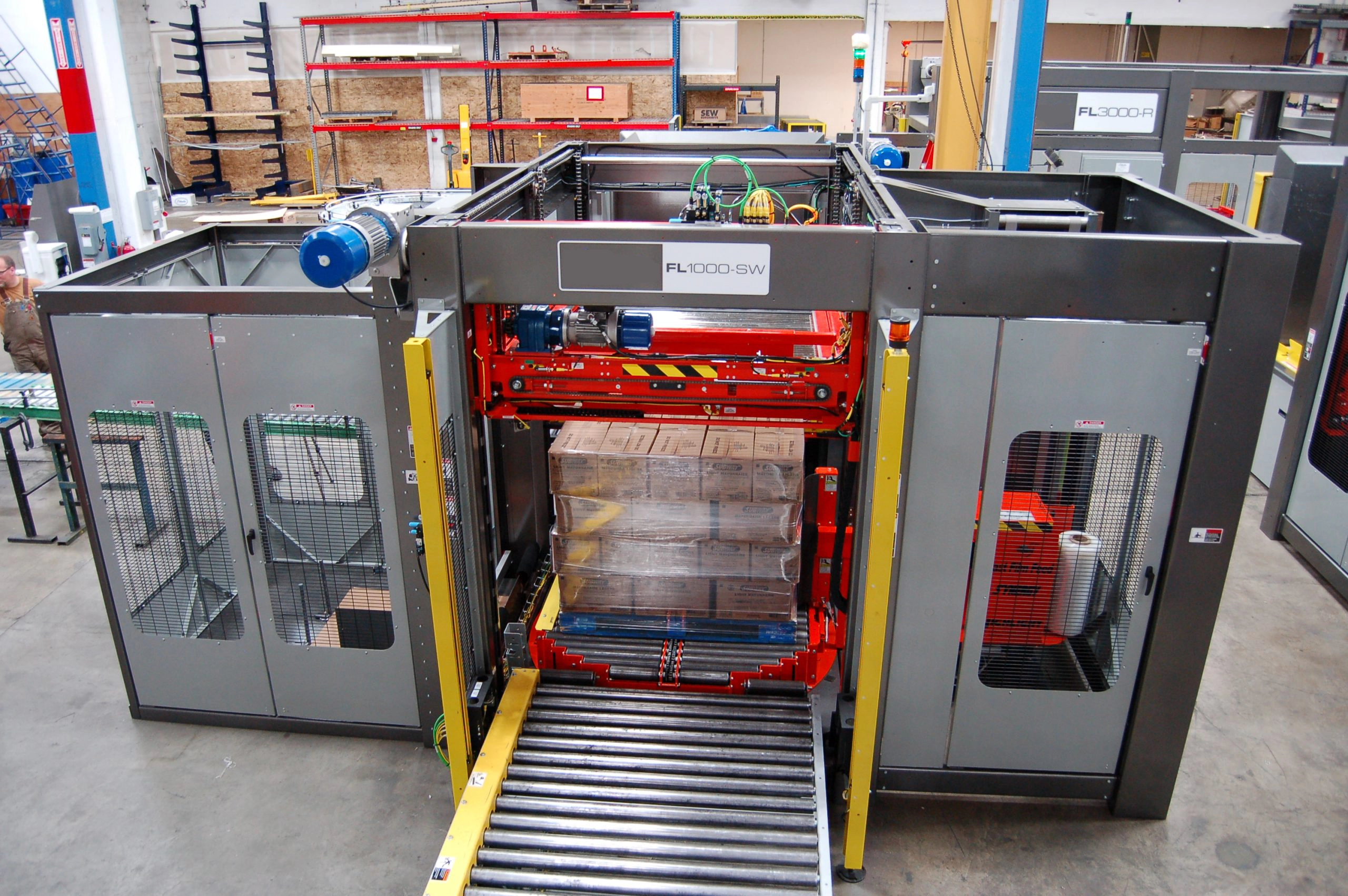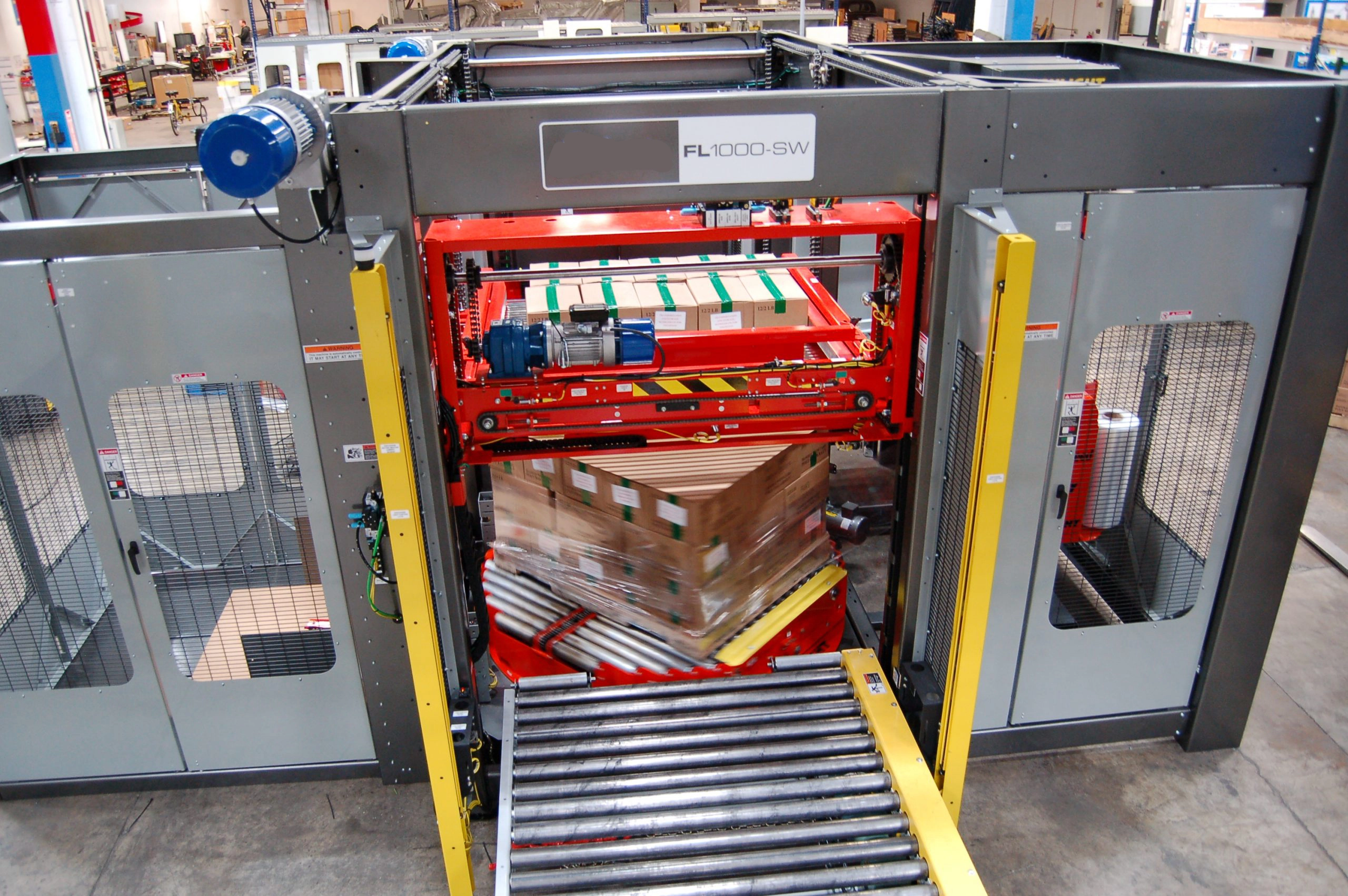 FL1000-SW menggabungkan palletizer berukuran kecil, tangguh, dan tugas berat dengan fungsionalitas tambahan berupa pembungkus elastis yang terintegrasi sepenuhnya dan terbukti di industri.