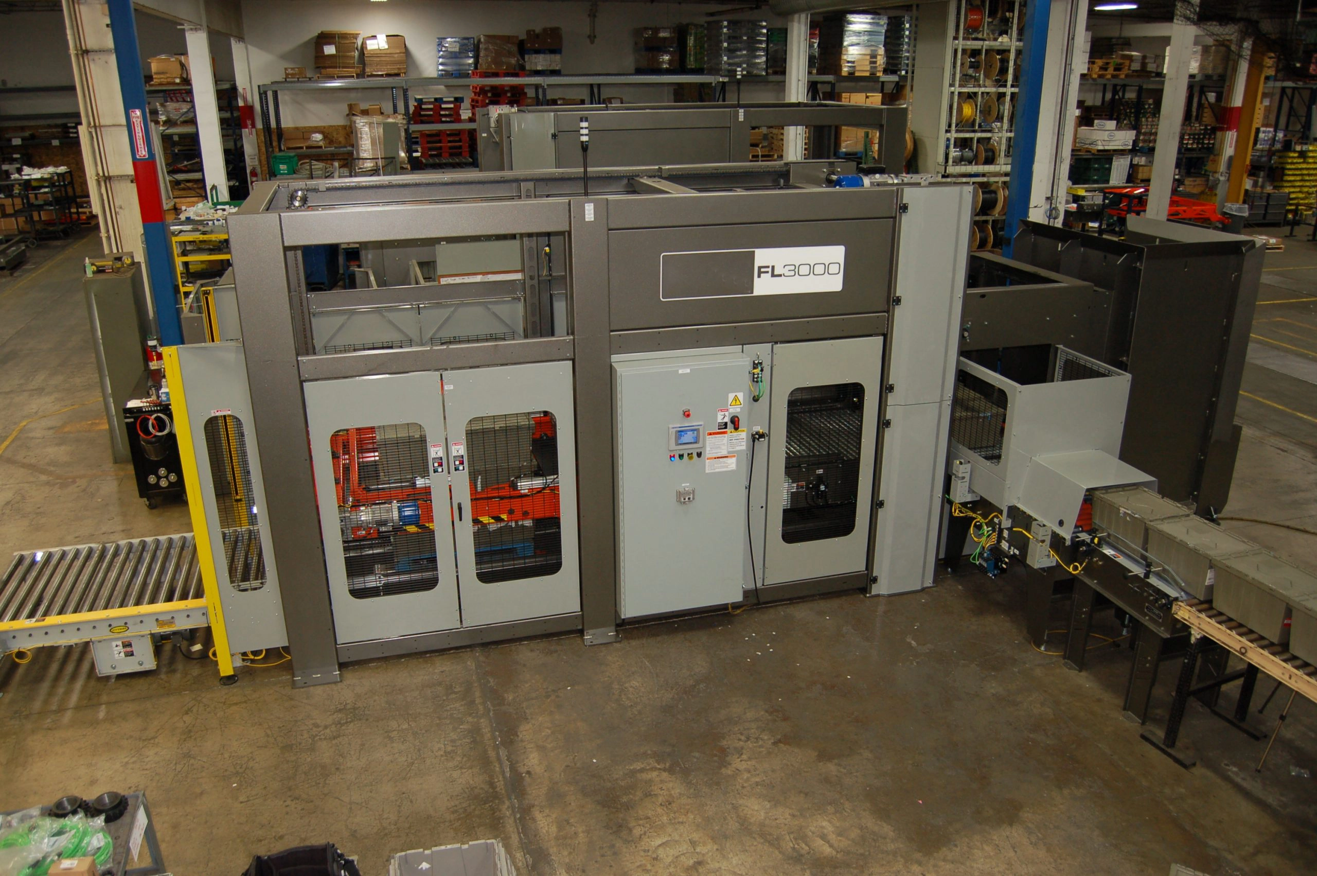 Tonton proses FL3000 yang menumpuk kotak, bundel cat, kotak susu, dan banyak lagi.