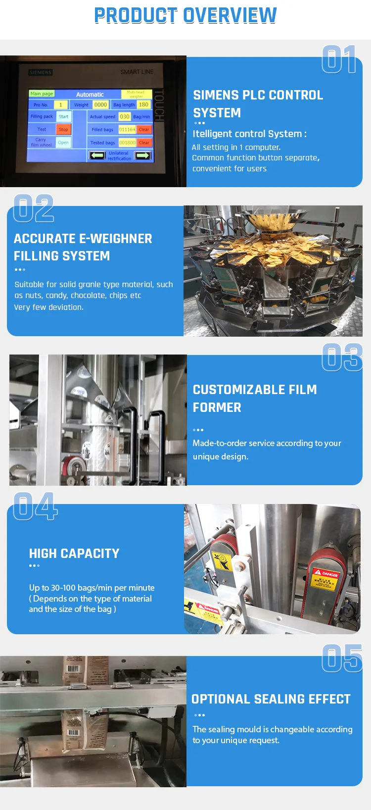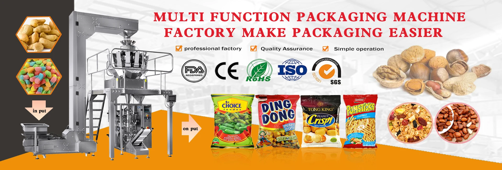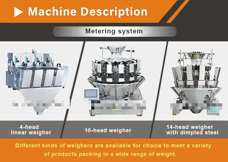Ini adalah mesin pengemas makanan otomatis multifungsi tingkat tinggi, yang terutama digunakan untuk mengemas berbagai jenis makanan, seperti keripik, dendeng sapi, buah kering, udang, biji-bijian, coklat, dan lainnya. Mesin ini termasuk dalam perangkat kemasan primer karena langsung mengemas makanan, membentuk unit kemasan yang siap dijual, memudahkan produk untuk memasuki pasar.