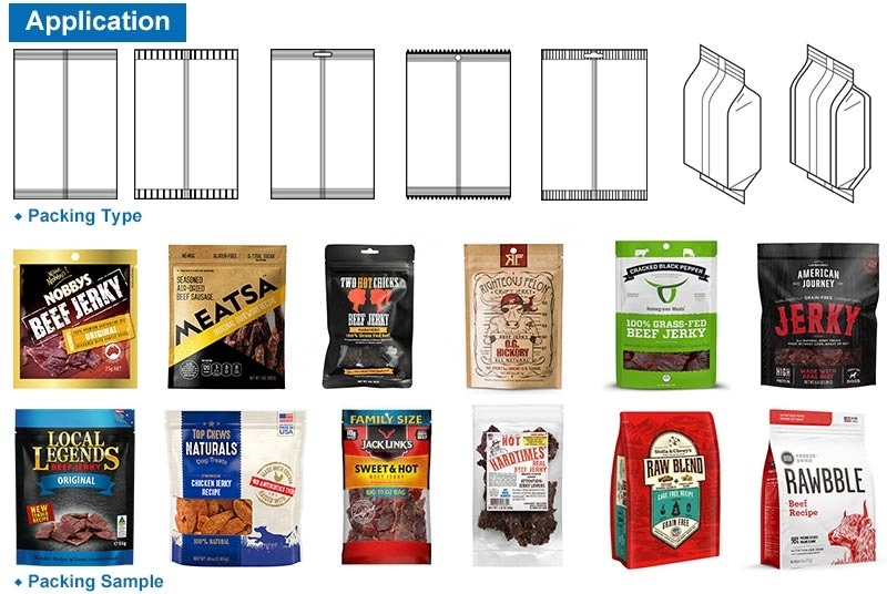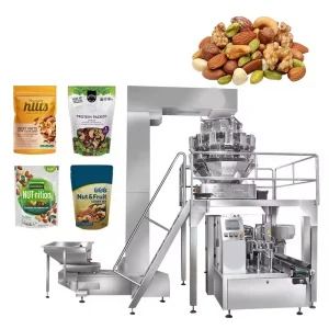 Mesin Pengemas Rotary Kantong Daging Sapi Siap Saji Otomatis dengan Penimbang Multihead. Cocok untuk semua jenis biji-bijian dan bahan padat, seperti daging sapi kering, dendeng, biltong, permen, kacang-kacangan, kismis, kacang tanah, biji melon, kacang-kacangan, kacang kecil, cokelat, buah yang diawetkan, keripik kentang, makanan hewan peliharaan, makanan yang dilatan, dll.
