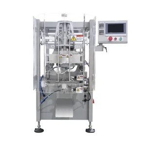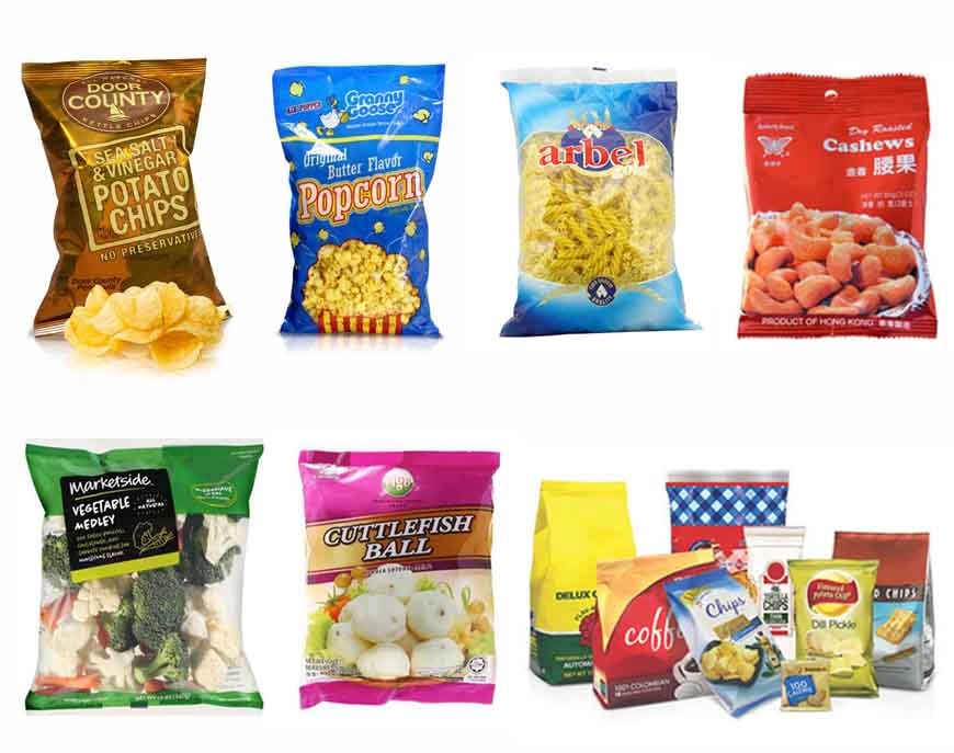 Mesin Pengemasan Vertikal Otomatis Penuh cocok untuk mengemas bahan yang mudah pecah dan memiliki akurasi tinggi seperti: makanan yang mengembang, nasi goreng, jeli, permen, pistachio, irisan apel, pangsit, cokelat, makanan hewan peliharaan, perkakas kecil, obat-obatan, dll.