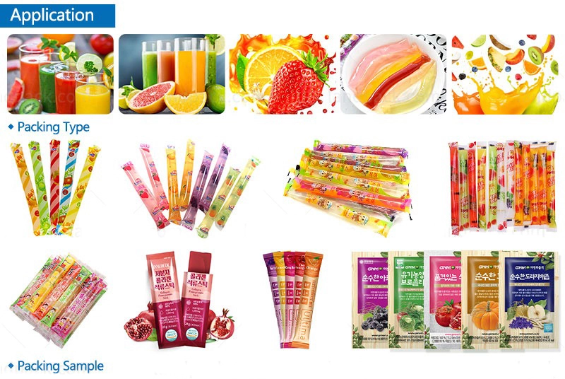 Mesin pengemas stik cairan multi-jalur dengan berbagai rasa yang cocok untuk berbagai jenis produk cair, seperti es loli, es loli, jeli, obat kumur, saus tomat, perasa, saus, pasty, sampo, saus salad, krim, cairan sabun mandi, dan sebagainya.